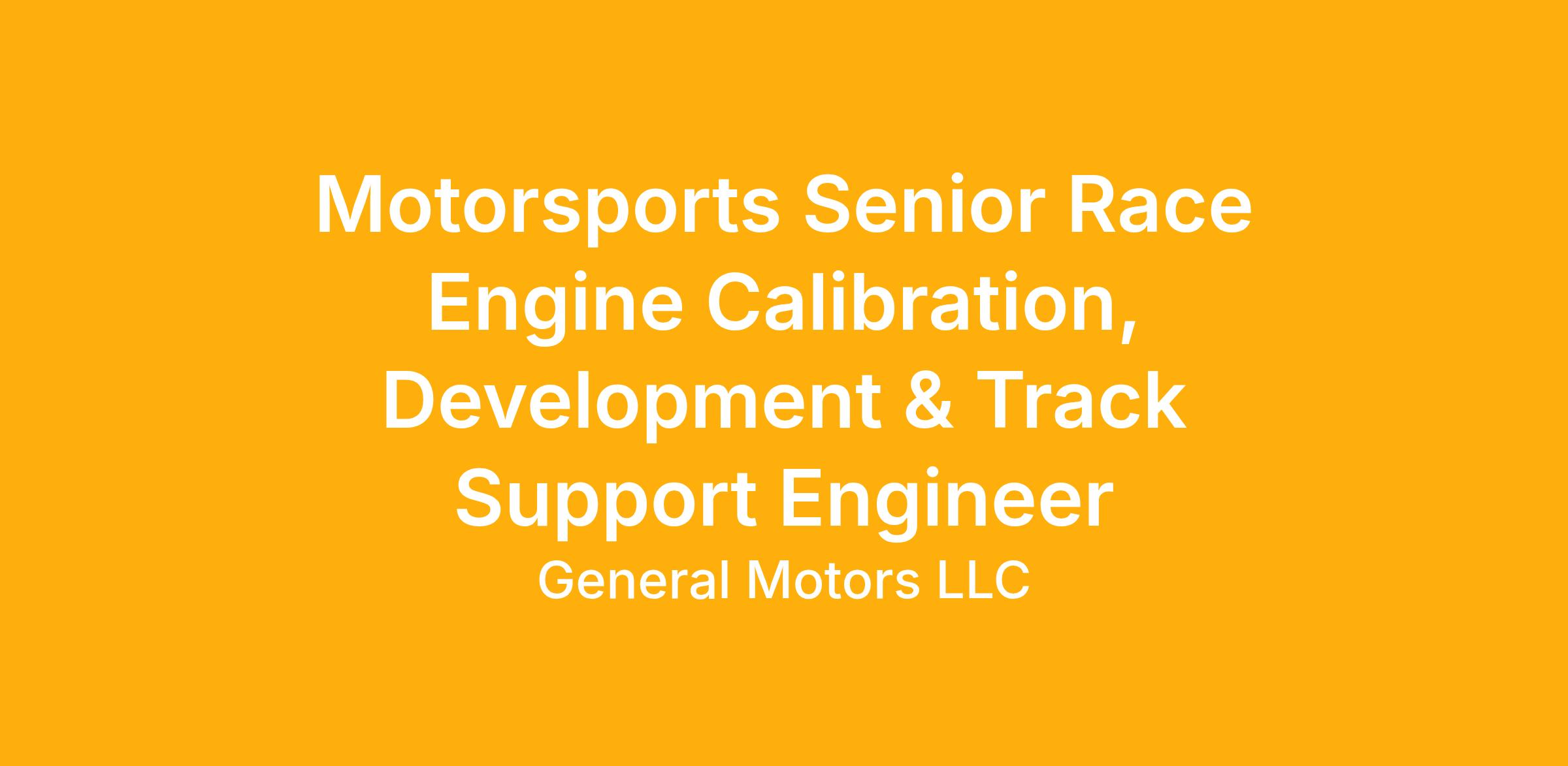 We are seeking a Senior Race Engine Development and Track Support Engineer to support propulsion system activities within GM's exciting Corvette GT3 race program. In this role you will be responsible for developing and implementing propulsion controls and calibration solutions to assist our partner teams in their success at the track. Your creativity, initiative, and high level of independent judgment are key to your success. In addition to GM on-site development activities, this role requires extensive domestic and/or international travel to support testing and race event weekends.
